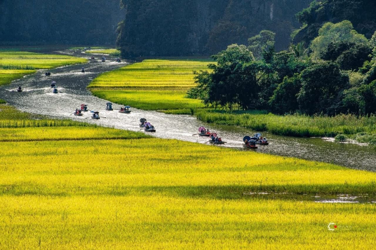 13.15 Pm. After our lunch, we walk to the Tam Coc boat station to discover the beauty of nature on Sampan boat. We enjoy the sightseeing of caves, limestone mountain on river – which is called Ha Long on Land. Your local rower will do paddle to take you pass through inside caves. You discover very beautiful stalactite and rice fields are surrounded by limestone mountain systems along the river. The picture of natural beauty will be shown you.